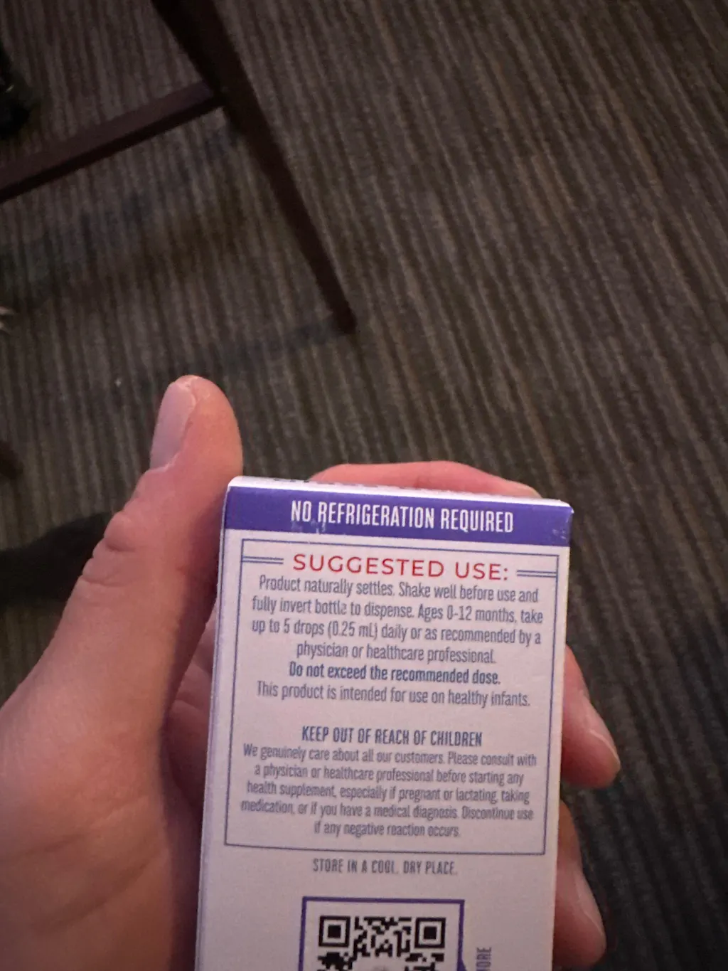 Suggested Use: Product naturally settles. Shake well before use. Ages 0-12 months, take up to 5 drops (0.25 mL) daily or as recommended by a physician or healthcare professional. Do not exceed the recommended dose.
